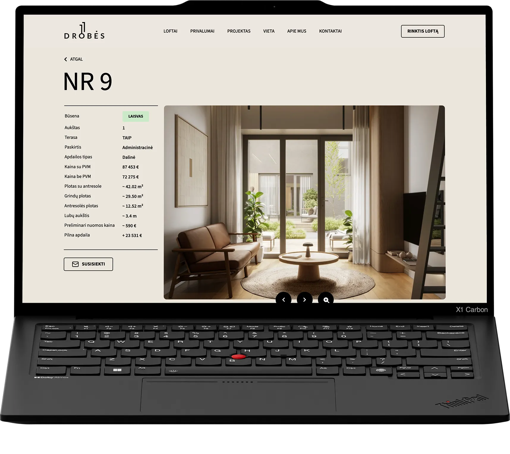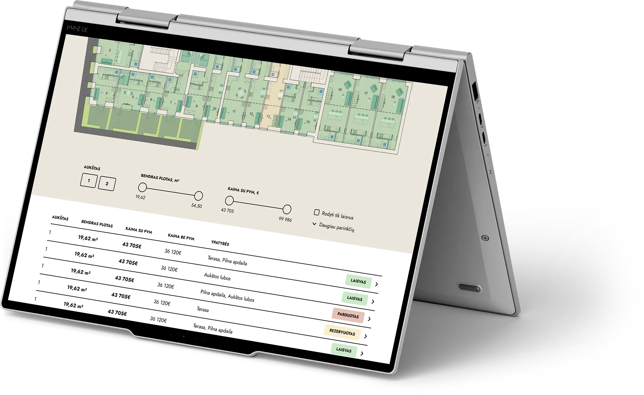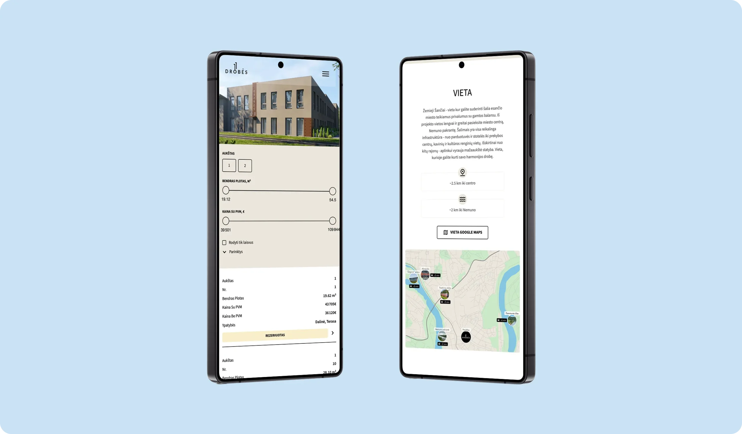 Sukūrėme interaktyvų filtrą, leidžiantį pasirinkti butus pagal skirtingus kriterijus. Aiškiai pateikėme vizualizacijas, planus, techninius parametrus ir vietos privalumus.